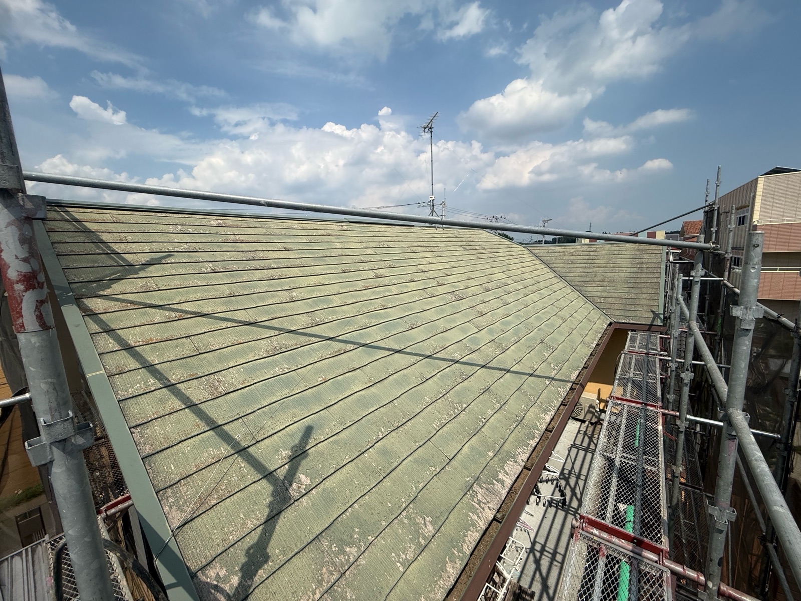 症例紹介 ホーム症例紹介茨城県つくば市 屋根カバー工事 2026/02/04茨城県つくば市 屋根カバー工事施工方法:屋根カバー工事金額:00000担当者の説明施工場所:茨城県つくば市 施工内容:屋根カバー工事 本症例では、既存屋根の劣化および防水性能の低下が確認されたため、屋根洗浄後に屋根カバー工法による施工を実施しました。 施工前に高圧洗浄を行い、屋根表面に付着した汚れ・コケ・劣化物質を除去。 下地の状態を確認した上で、既存屋根を撤去せず、新しい屋根材を重ねて施工するカバー工法を採用しました。 本工法により、 ・防水性能の向上 ・耐久性の強化 ・断熱性の改善 ・美観の回復 を実現し、建物全体の保護性能を高める結果となりました。 既存屋根を活かした施工方法のため、廃材の削減および工期短縮にもつながり、建物への負担を抑えた工事内容となっています。 建幸番長では、現地調査・建物診断をもとに、建物の状態に最適な施工方法をご提案しております。 屋根の劣化や雨漏り対策、リフォームをご検討の方は、お気軽にご相談ください。 ⇒無料のお問い合わせはこちらから! 症例紹介一覧へ戻る PAGE TOP