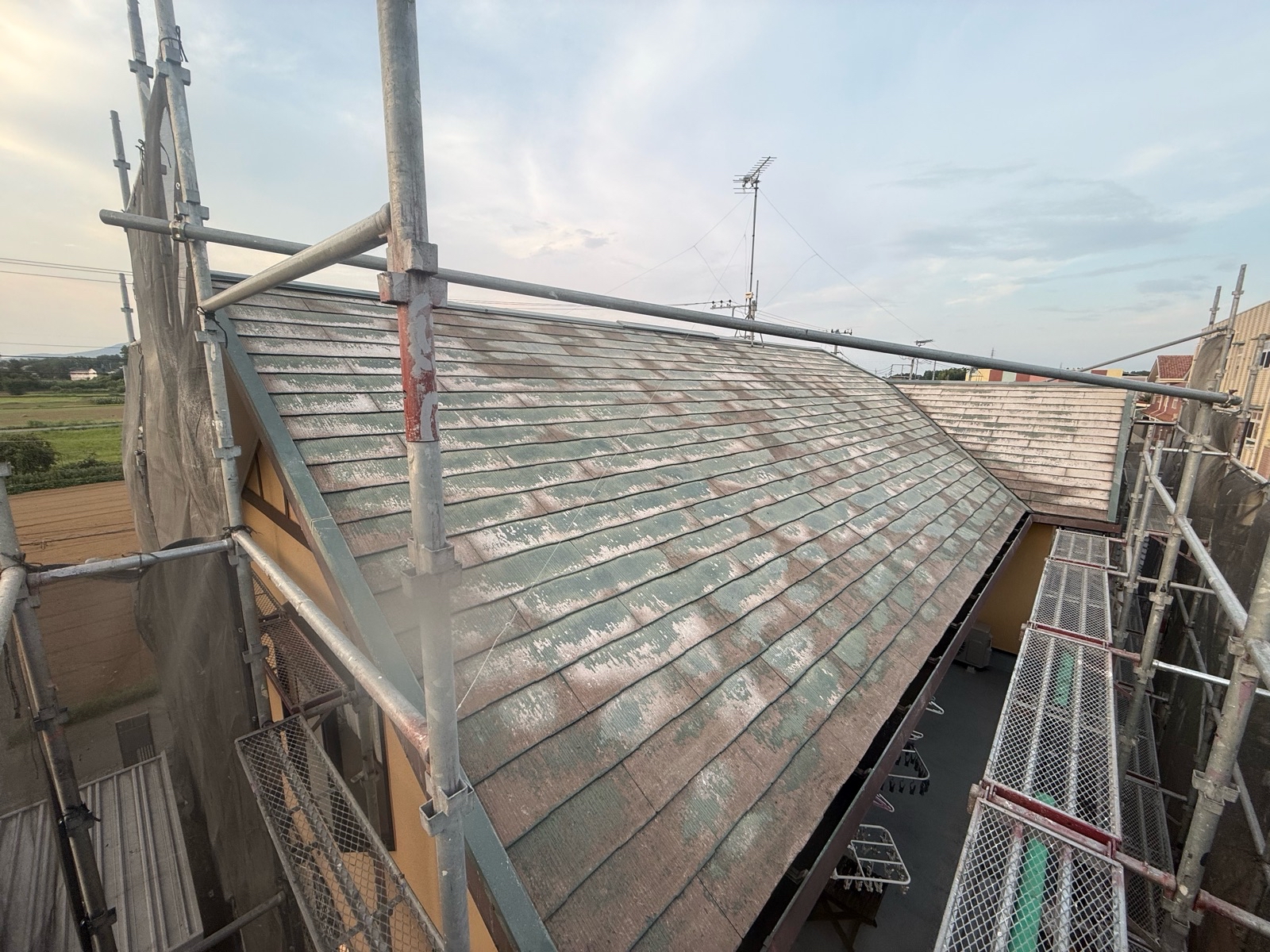 施工前に高圧洗浄を行い、屋根表面に付着した汚れ・コケ・劣化物質を除去。