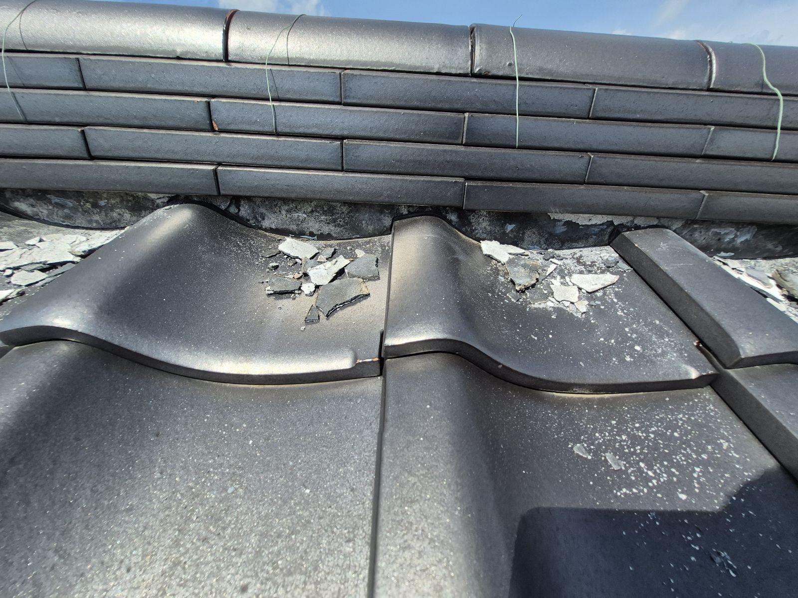 棟瓦の漆喰部分に、経年劣化による剥がれ・欠け・ひび割れが複数箇所確認できました。