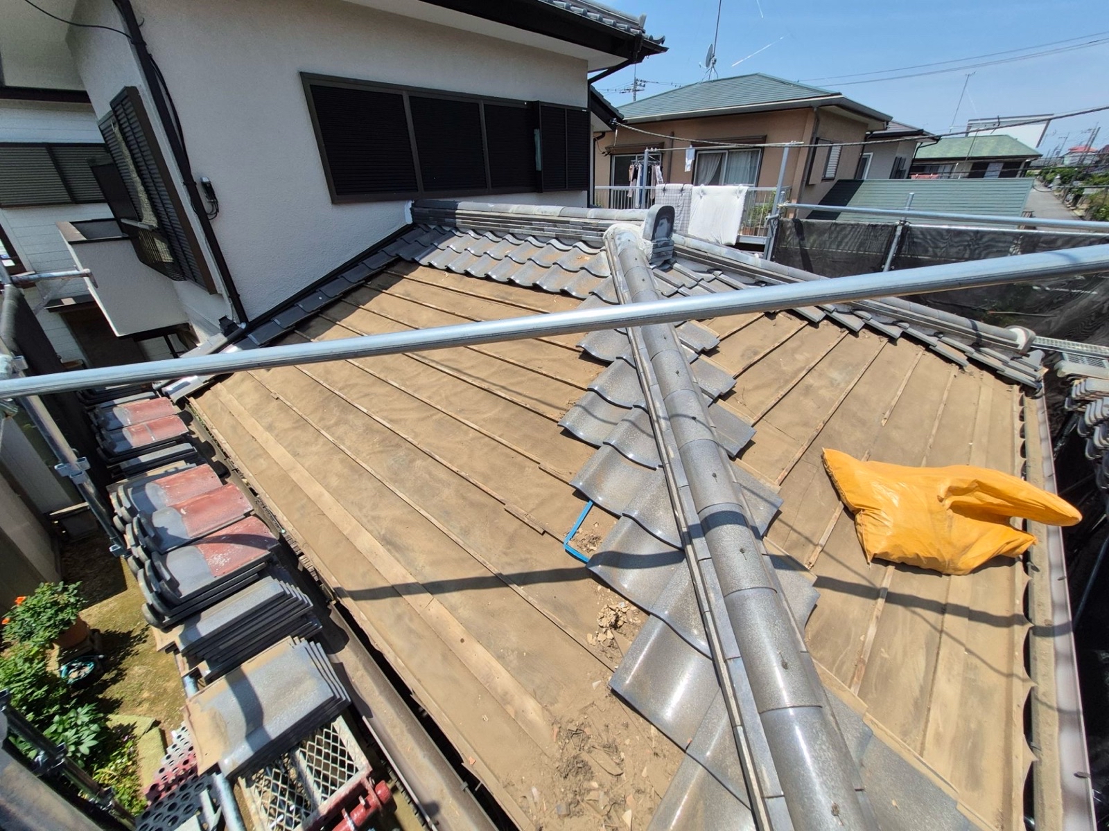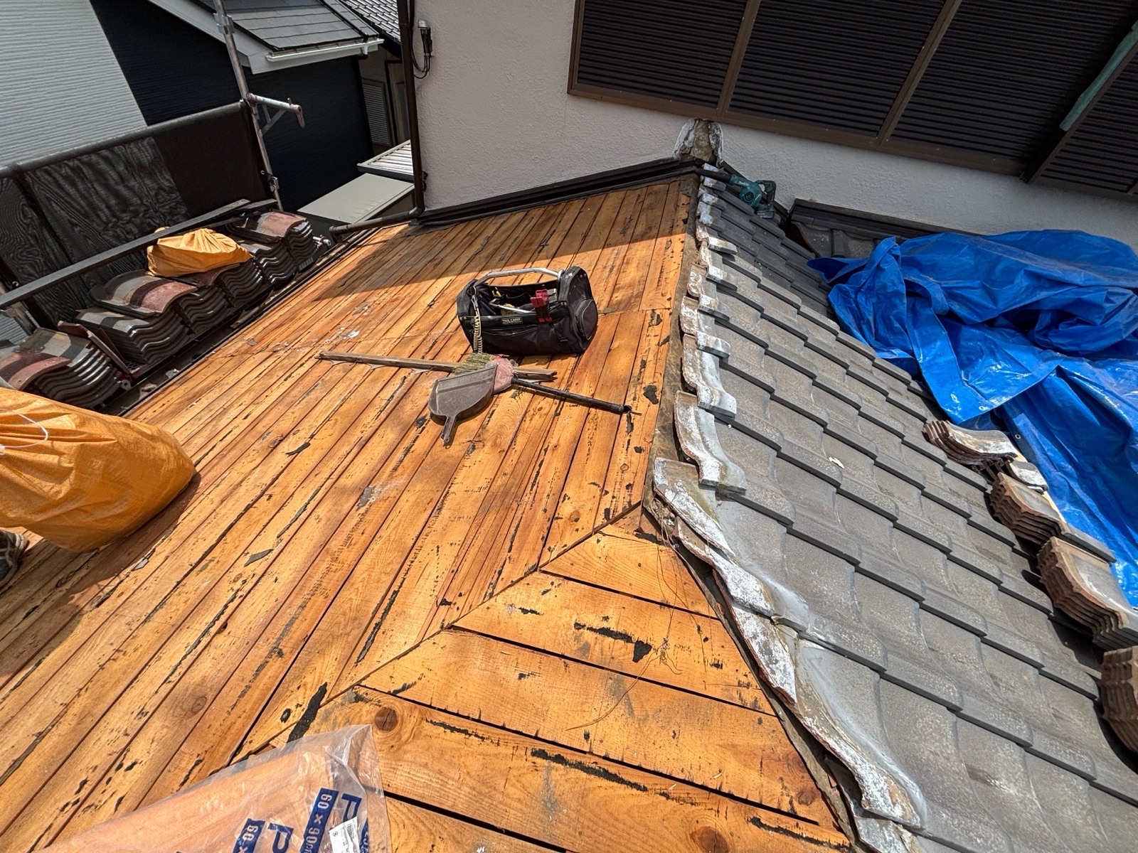 既存の瓦をすべて撤去し、傷んだ部分を新しい木材で補強・交換。