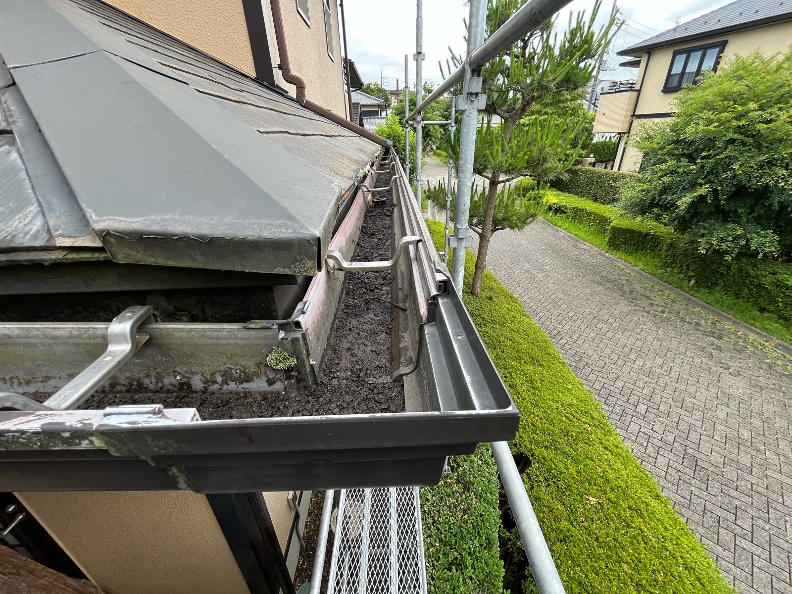 今回のお住まいでは、長年の落ち葉や土、苔が雨樋内部に厚く堆積し、排水がほとんどできないほど重度の詰まりが発生していました。雨が降るたびに雨水が溢れ出し、外壁を伝って流れ落ちることで、外壁の汚れや劣化、さらには軒天や基礎部分への水の回り込みといった二次被害が懸念される危険な状態でした。このまま放置すると、家全体の寿命に影響を与える可能性があるため、早急な対処が必要でした。